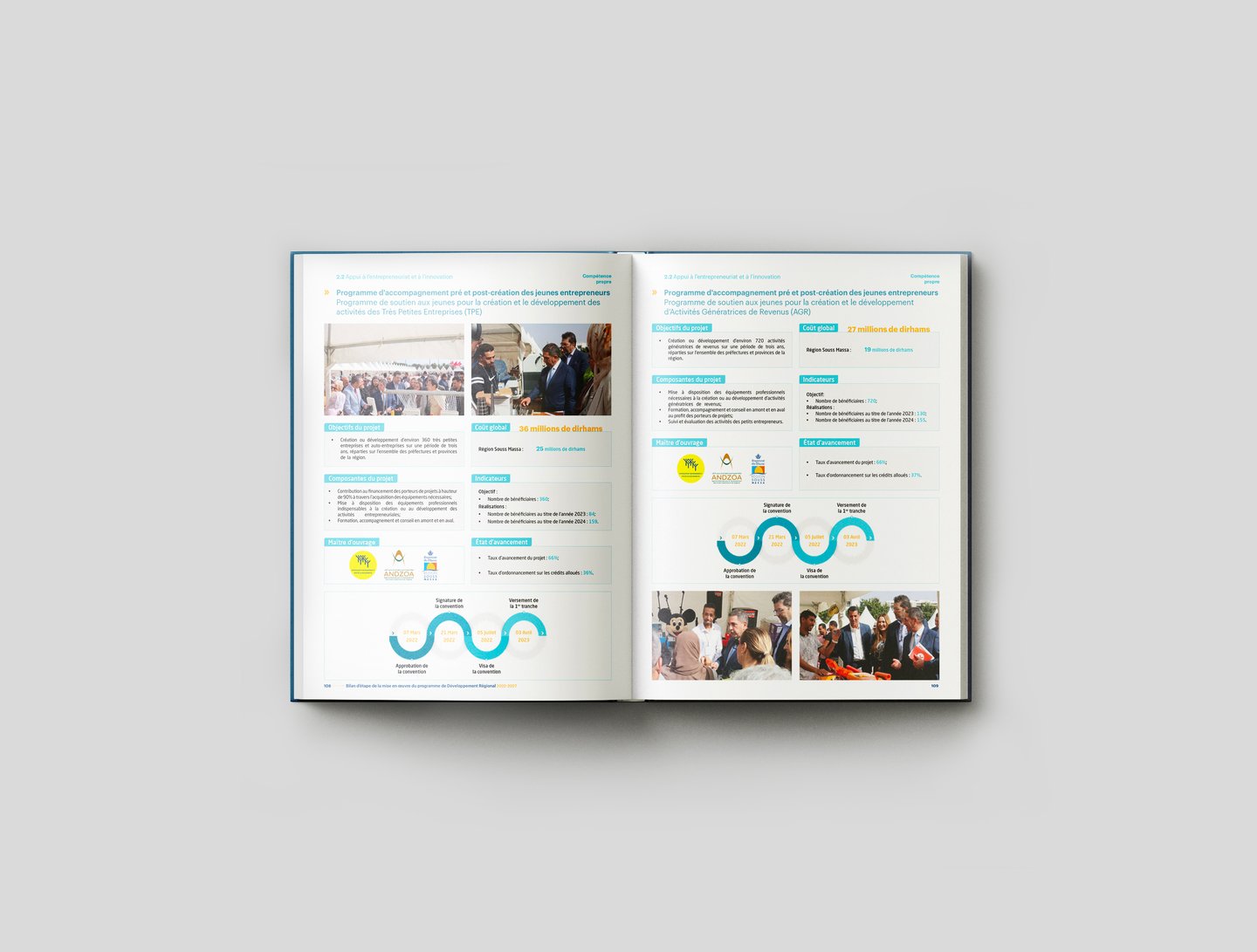 Le Bilan d’étape de la mise en œuvre du Programme de Développement Régional 2022-2027 est un ouvrage institutionnel conçu sous la forme d’un beau livre mettant en valeur l’avancée des projets territoriaux du Souss Massa.