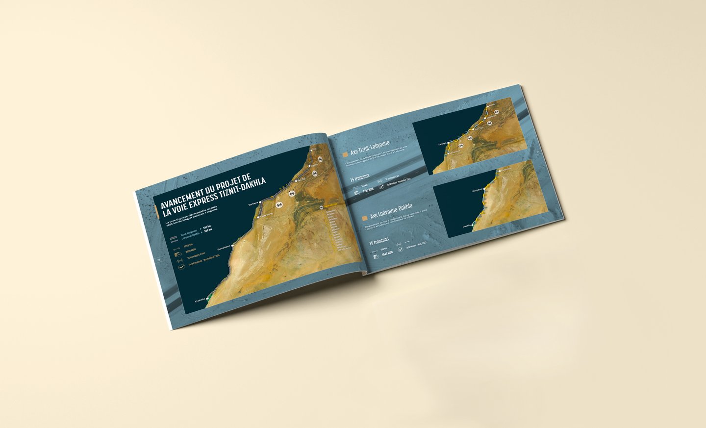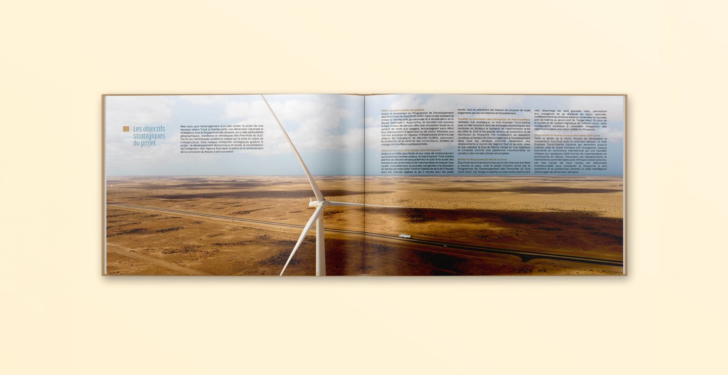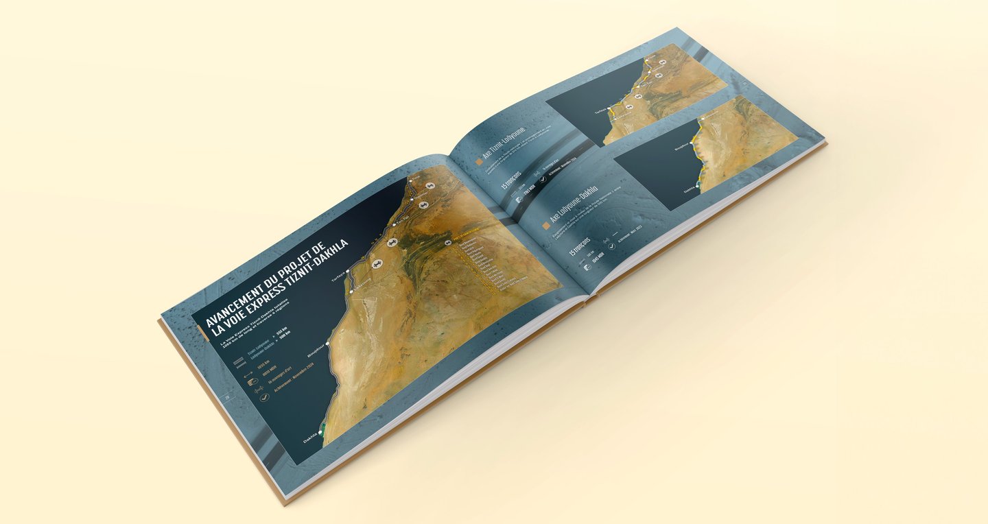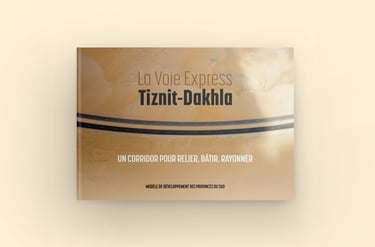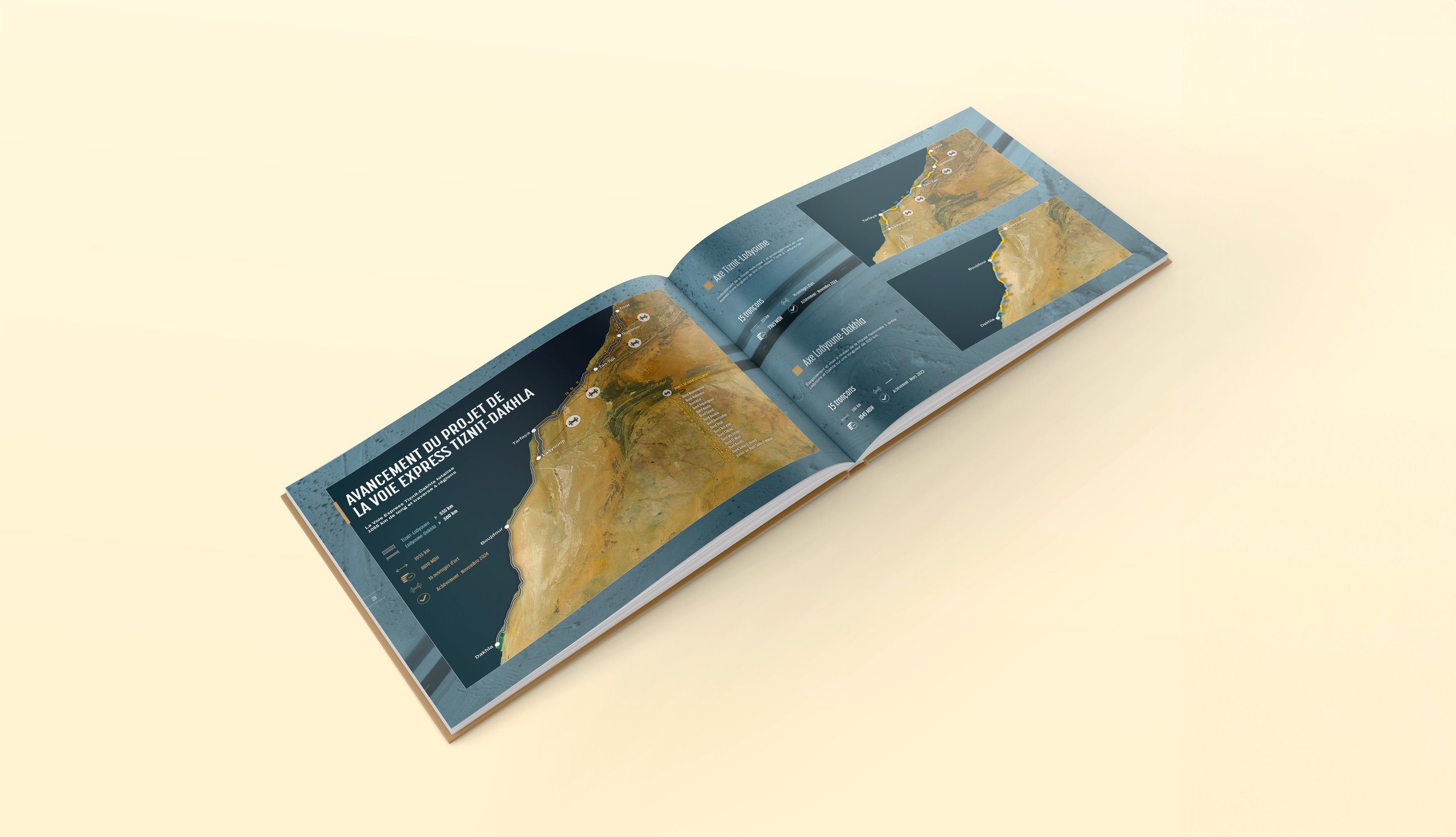 À l’occasion du 50e anniversaire de la Marche Verte, AZIGZAO a signé l’identité graphique et éditoriale d’une édition spéciale consacrée à la mise en valeur de la Voie Express Tiznit–Dakhla, un ouvrage majeur inscrit dans le Programme Royal de Développement des Provinces du Sud.