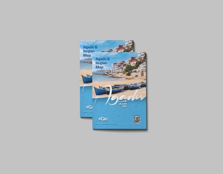 Carte touristique illustrée avec repères clairs et adresses locales. Un support pratique, distribué dans les lieux clés d’Agadir pour orienter les visiteurs et valoriser les acteurs du territoire.